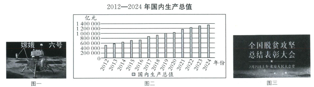 (1)①选择图一。理由:嫦娥六号是我国航天科技的重大成果,体现了我国实施创新驱动发展战略的成效,彰显了我国的科技实力,有利于推动建设科技创新强国。②选择图二。理由:国内生产总值持续增长,反映出我国经济持续健康发展,综合国力不断增强,为人民生活改善和国家发展奠定了物质基础。③选择图三。理由:脱贫攻坚战取得全面胜利,体现了党和政府坚持以人民为中心的发展思想,有利于实现共同富裕,彰显了中国特色社会主义制度的优越性。