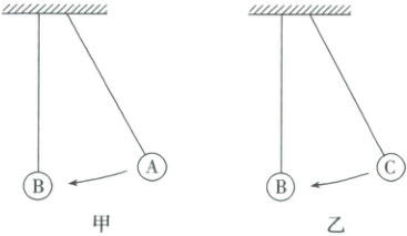 (2)如图乙所示,A球换成大小相同的C球,使C球质量大于B球质量,用手拉起C球至某一高度后放开,撞击静止的B球,发现碰撞后B球获得
