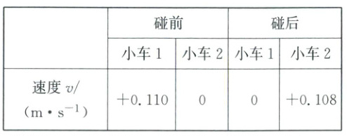 实验2:使$ m_1 = m_2 = 0.25 \, kg $,让运动的小车1(质量为$ m_1 $)碰静止的小车2(质量为$ m_2 $),碰后两小车一起运动,数据如表2。