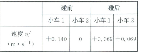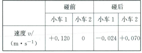 碰后物体的质量$ m $与速度$ v $的乘积$ mv $。实验2:使$ m_1 = m_2 = 0.25 \, kg $,让运动的小车1(质量为$ m_1 $)碰静止的小车2(质量为$ m_2 $),碰后两小车一起运动,数据如表2。