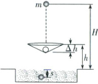 3. 有一质量为 $m = 1.0\ kg$ 的小球静止于水平地面上方高度为 $H = 5.55\ m$ 处,其正下方为一沙坑,离地面高度为 $h = 0.55\ m$ 处固定有一弹性拦阻网。小球从静止释放,触网后继续下落 $\Delta h = 0.1\ m$ 时网被击穿,击穿后小球落入沙坑之中,陷入深度为 $s = 0.1\ m$,已知小球触网时间为 $\Delta t = 0.2\ s$,沙坑对小球的阻力恒为 $f = 135\ N$,重力加速度 $g$ 取 $10\ m/s^{2}$,求:
