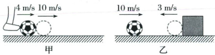向仍向右(如图甲),求踢球过程中足球动量的改变量;(2) 若足球以$10\ m/s$的速度向右撞向球门门柱,然后以$3\ m/s$的速度反向弹回(如图乙),求这一过程中足球的动量改变量。