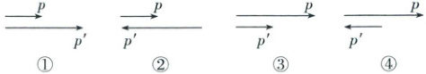 [针对训练] 2. 如图所示,$p$、$p'$分别表示物体受到外力作用前、后的动量,短线表示的动量大小为$15\ kg · m/s$,长线表示的动量大小为$30\ kg · m/s$,箭头表示动量的方向。在下列所给的四种情况中,物体动量变化量相同的是 (