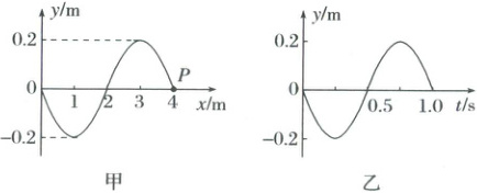 (1)由题图甲得波长λ=4 m,由题图乙得周期T=1.0 s,所以波速v=$\frac{\lambda}{T}$=4 m/s。由题图乙可知1.0 s时质点P向y轴负方向振动,故波沿x轴负方向传播。