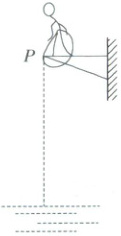 [例 4] “蹦极”是一项勇敢者的运动,如图所示,某人用弹性橡皮绳拴住身体从高空$P$处自由下落,在空中感受完全失重的滋味。此人质量为$50\ {kg}$,橡皮绳原长$45\ {m}$,人可看成质点,且此人从$P$点自静止下落到最低点所用时间$t_{总} = 9\ {s}$。($g$取$10\ {m/s^2}$)
