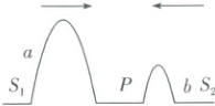 [例 2] (多选)如图所示,波源$S_1$在绳的左端发出频率为$f_1$、振幅为$A_1$的半个波形$a$,同时另一个波源$S_2$在绳的右端发出频率为$f_2$、振幅为$A_2$的半个波形$b$,且$f_1 < f_2$,$P$为两个波源连线的中点。已知机械波在介质中传播的速度只由介质本身的性质决定。下列说法正确的是 (