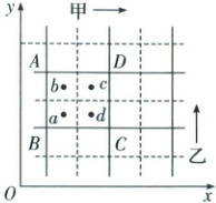 置,虚线表示波谷位置。对图中正方形中央的 $a$、$b$、$c$、$d$ 四点的振动情况,判断正确的是 (