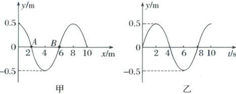 [典例3] 图甲为一列简谐横波在某一时刻的波形图,$ A、B $两质点的横坐标分别为$ x_A = 2 \, m $和$ x_B = 6 \, m $;图乙为质点$ B $从该时刻开始计时的振动图像。下列说法正确的是(