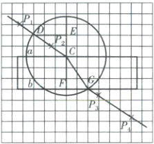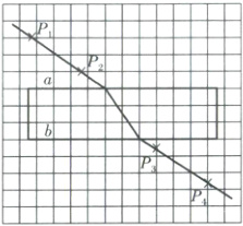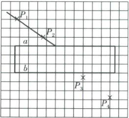 (1) 该实验小组的学生将玻璃砖放置于方格纸上,$a$、$b$为玻璃砖与空气接触的相互平行的两个表面。学生通过“插针法”确定了四颗大头针$P_1$、$P_2$、$P_3$、$P_4$的位置并画出了部分光线径迹,请根据实验原理将光线径迹补充完整。