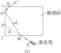 (2) ①激光笔发出的激光从玻璃砖上的$M$点水平入射,到达$ef$面上的$O$点后反射到$N$点射出。用大头针在白纸上标记$O$点、$M$点和激光笔出光孔$Q$的位置。