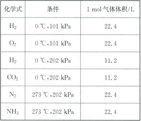 2.提示:利用$V_m=22.4 L· mol^{-1}$计算时,应注意两点:①是否为标准状况;②是否为气体。如苯、$CCl_4$、乙醇、$H_2O$在标准状况下不是气体,不能利用$22.4 L· mol^{-1}$进行计算。