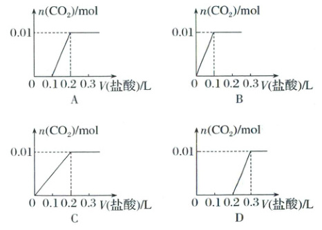 4.D $\mathrm{NaOH}$和$\mathrm{Na_2CO_3}$的物质的量均为0.01mol,向二者的混合液中滴加盐酸时,$\mathrm{HCl}$先与$\mathrm{NaOH}$反应,消耗0.1mol·$\mathrm{L^{-1}}$盐酸的体积为0.1L,然后$\mathrm{HCl}$再与$\mathrm{Na_2CO_3}$发生反应$\mathrm{Na_2CO_3 + HCl \xlongequal\ NaCl + NaHCO_3}$,消耗0.1L0.1mol·$\mathrm{L^{-1}}$盐酸生成0.01mol$\mathrm{NaHCO_3}$,上述过程中均无气体逸出,共消耗盐酸0.2L。最后盐酸与$\mathrm{NaHCO_3}$发生反应$\mathrm{NaHCO_3 + HCl \xlongequal\ NaCl + CO_2 \uparrow + H_2O}$,0.01mol$\mathrm{NaHCO_3}$消耗0.1L0.1mol·$\mathrm{L^{-1}}$盐酸,生成0.01mol二氧化碳气体,D项符合题意。