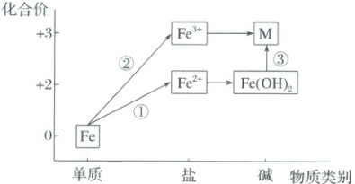 (1)M的化学式为$\mathrm{Fe(OH)}_3$,物质类别是碱;