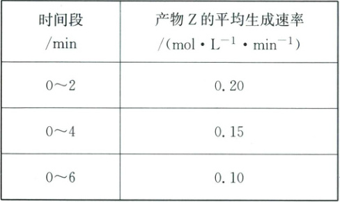 5.B 反应开始一段时间,随着时间的延长,反应物浓度逐渐减小,产物Z的平均生成速率逐渐减小,则$0\sim1\ min$内Z的平均生成速率大于$0\sim2\ min$内的,故$1\ min$时,Z的浓度大于$0.20\ mol· L^{-1}$,A正确;$4\ min$时生成的Z的物质的量为$0.15\ mol· L^{-1}×4\ min×1\ L=0.6\ mol$,$6\ min$时生成的Z的物质的量为$0.10\ mol· L^{-1}· min^{-1}×6\ min×1\ L=0.6\ mol$,故反应在$4\ min$时已达到平衡,设达到平衡时生成了$a\ mol\ Y$,列三段式:$2 X(s)\rightleftharpoons Y(g)+2 Z(g)$ 初始量/mol 2.0 0 0 转化量/mol $2a$ $a$ $2a$ 平衡量/mol $2.0 - 2a$ $a$ $0.6$ 根据$2a = 0.6$,得$a = 0.3$,则Y的平衡浓度为$0.3\ mol· L^{-1}$,Z的平衡浓度为$0.6\ mol· L^{-1}$,平衡常数$K = c^{2}( Z)· c( Y) = 0.108\ mol^3· L^{-3}$,$2\ min$时Y的浓度为$0.2\ mol· L^{-1}$,Z的浓度为$0.4\ mol· L^{-1}$,加入$0.2\ mol$Z后Z的浓度变为$0.6\ mol· L^{-1}$,$Q = c^{2}( Z)· c( Y) = 0.072\ mol^3· L^{-3}< K$,反应正向进行,故$v_{ 正}( Z)>v_{ 逆}( Z)$,B错误;反应生成的Y与Z的物质的量之比恒等于$1:2$,反应体系中只有Y和Z为气体,相同条件下,体积之比等于物质的量之比,则$\frac{v( Y)}{v( Z)}=\frac{1}{2}$,故Y的体积分数始终约为$33.3\%$,C正确;由B项分析可知$5\ min$时反应处于平衡状态,此时生成Z为$0.6\ mol$,则X的转化量为$0.6\ mol$,初始X的物质的量为$2\ mol$,剩余X的物质的量为$1.4\ mol$,D正确。