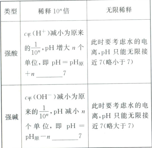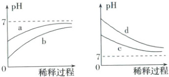 ② 浓度相等的酸或碱溶液稀释后溶液 pH 的变化示意图