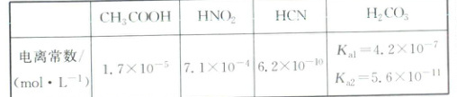 (1)提示:相同条件下,电离常数越大,酸性越强,故酸性:$HNO_2>$ $CH_3COOH>H_2CO_3>HCN$。