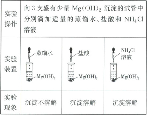 (2)$ Mg(OH)_2$存在沉淀溶解平衡:$ Mg(OH)_2(s) \rightleftharpoons Mg^{2+}(aq) + 2 OH^-(aq)$,$ NH_4 Cl$电离出的$ NH_4^+$与$ OH^-$结合生成弱电解质$ NH_3· H_2 O$,使平衡体系中的$c( OH^-)$不断减小,平衡向沉淀溶解的方向移动,直至$ Mg(OH)_2$完全溶解