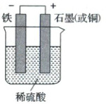 (2)因为总反应为$\mathrm{Fe}+\mathrm{H}_2\mathrm{SO}_4=\mathrm{FeSO}_4+\mathrm{H}_2\uparrow$,所以负极为$\mathrm{Fe}$,正极可为$\mathrm{Cu}$或石墨,电解质为稀硫酸,即可画出装置图。