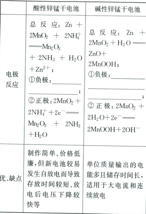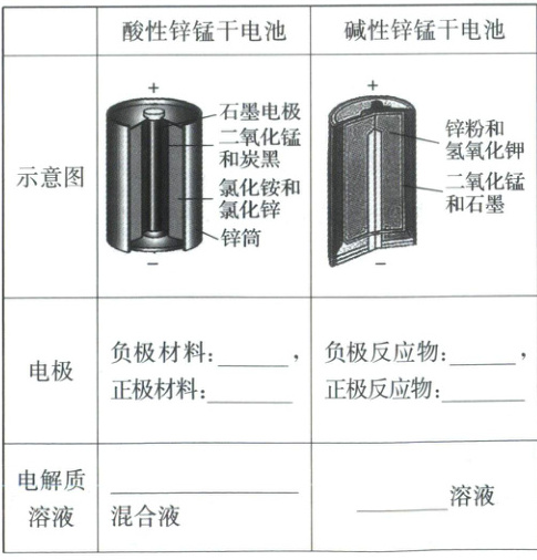 (2)锌 石墨棒 锌粉 二氧化锰 氯化铵和氯化锌 氢氧化钾 $Zn-2e^{-}=Zn^{2+}$ $Zn + 2OH^{-}-2e^{-}=ZnO + H_{2}O$
