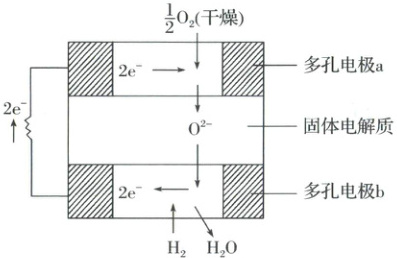 2. 固体氧化物燃料电池是以固体氧化锆-氧化铪为电解质, 这种固体电解质在高温下允许氧离子 ($\mathrm{O}^{2-}$) 在其间通过。该电池的工作原理如图所示, 其中多孔电极 a、b 均不参与电极反应。下列判断正确的是 (