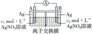 1.(浓差电池)溶质由高浓度向低浓度扩散而引发的一类电池称为浓差电池。如图是由Ag电极和硝酸银溶液组成的电池($c_1<c_2$),工作时,A电极的质量不断减轻,下列说法正确的是 (