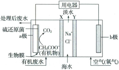 2.(微生物电池)如图装置是一种微生物脱盐电池的装置,它可以通过处理有机废水(以含$CH_3COO^-$的溶液为例)获得电能,同时还可实现海水淡化。已知a、b电极为惰性电极,X、Y均为离子交换膜,下列说法错误的是 (