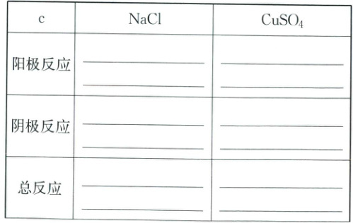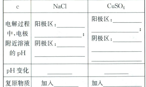 (3)$2Cl^{-} - 2e^{-} \longrightarrow Cl_{2} \uparrow$ $2H_{2}O - 4e^{-} \longrightarrow O_{2} \uparrow + 4H^{+}$ $2H_{2}O + 2e^{-} \longrightarrow H_{2} \uparrow + 2OH^{-}$ $2Cu^{2+} + 4e^{-} \longrightarrow 2Cu$ $2H_{2}O + 2Cl^{-} \stackrel{通电}{ \longrightarrow }Cl_{2} \uparrow + H_{2} \uparrow + 2OH^{-}$ $2H_{2}O + 2Cu^{2+}\stackrel{通电}{ \longrightarrow }2Cu + O_{2} \uparrow + 4H^{+}$ 一开始不变,后来增大 pH不断增大 pH不断减小 一开始几乎不变,后来pH不断减小 增大 减小 HCl或CuO或CuCO3