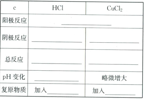 (2)$2Cl^{-} - 2e^{-} \longrightarrow Cl_{2} \uparrow$ $2H^{+} + 2e^{-} \longrightarrow H_{2} \uparrow$ $Cu^{2+} + 2e^{-} \longrightarrow Cu$ $2Cl^{-} + 2H^{+}\stackrel{通电}{ \longrightarrow }Cl_{2} \uparrow + H_{2} \uparrow$ $2Cl^{-} + Cu^{2+}\stackrel{通电}{ \longrightarrow }Cl_{2} \uparrow +Cu$ 增大 HCl CuCl2