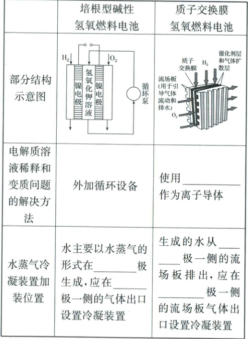 提示:以电解质溶液作为离子导体的氢氧燃料电池在使用时生成的水会稀释电解质溶液,碱性电解质溶液还会与二氧化碳反应,这些问题都会导致电池内阻增大,从而降低电池的工作效率。