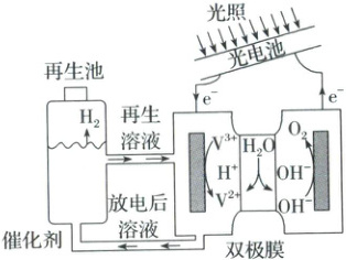 D.再生池中的反应为$2\mathrm{V^{2+}} + 2\mathrm{H_2O} \longrightarrow 2\mathrm{V^{3+}} + 2\mathrm{OH^-} + \mathrm{H_2} \uparrow$