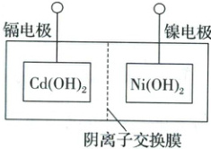 (2)我国自行研制的“神舟”飞船使用了镍镉蓄电池组,其充放电时发生的反应为$\mathrm{Cd} + 2\mathrm{NiOOH} + 2\mathrm{H_2O} \underset{ 充电}{\overset{ 放电}{\rightleftharpoons}} 2\mathrm{Ni(OH)_2} + \mathrm{Cd(OH)_2}$,其电池装置如图所示,阴离子交换膜两侧均注入$\mathrm{KOH}$溶液。