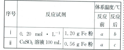 (2)100mL0.20mol·L⁻¹CuSO₄溶液中含有溶质的物质的量为0.02mol,1.20gFe粉的物质的量约为0.021mol,0.56gFe粉的物质的量为0.01mol,实验ⅰ中有0.02molCuSO₄发生反应,实验ⅱ中有0.01molCuSO₄发生反应,实验ⅰ放出的热量多,则b>c;若按实验ⅰ进行计算,ΔH = $\frac{4.18×1.0×100×(b - a)}{1000×0.02}$kJ·mol⁻¹ = -20.9(b - a)kJ·mol⁻¹;若按实验ⅱ进行计算,ΔH = $\frac{4.18×1.0×100×(c - a)}{1000×0.01}$kJ·mol⁻¹ = -41.8(c - a)kJ·mol⁻¹。
