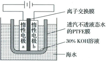 6.D 根据图示,b电极与电源负极相连,为阴极,结合题干信息可知,阴极反应为2H₂O + 2e⁻ = 2OH⁻ + H₂↑,A正确;该装置工作时阳极无氯气生成,则阳极反应为4OH⁻ - 4e⁻ = 2H₂O + O₂↑,阳极KOH溶液的浓度不变,则需要(OH⁻)由阴极移向阳极,故离子交换膜为阴离子交换膜,B正确;动能高的水分子可以穿过PTFE膜,C正确;由阴、阳极反应可知,电解总反应为2H₂O$\stackrel{通电}{=\!=\!=}$2H₂↑ + O₂↑,每生成1molH₂要消耗1molH₂O,已知电解生成氢气的速率为xmol·h⁻¹,则海水为电解池补水的速率也为xmol·h⁻¹,D错误。