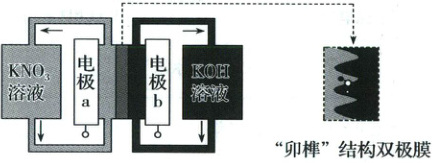 7.(2023·广东卷)用一种具有“卯榫”结构的双极膜组装电解池(如图),可实现大电流催化电解$KNO_3$溶液制氨。工作时,$H_2O$在双极膜界面处被催化解离成$H^+$和$OH^-$,有利于电解反应顺利进行。下列说法不正确的是 (