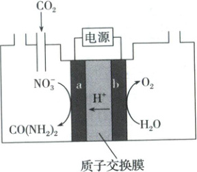 (2)电极a上硝酸根离子得电子转化为尿素,再由酸性环境可知,电极反应为2NO₃⁻ + 16e⁻ + CO₂ + 18H⁺ = CO(NH₂)₂ + 7H₂O。