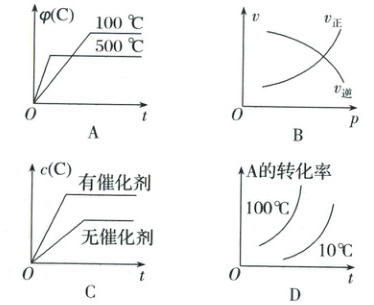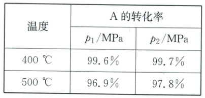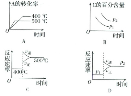 5.D 根据表格数据可知,在相同压强下,升高温度,A 的转化率降低,说明升高温度平衡逆向移动,所以正反应为放热反应。该反应的正反应是一个气体体积减小的反应,在相同的温度下,$p_1 \to p_2$,A 的转化率增大,说明化学平衡正向移动,即 $p_1<p_2$。升高温度,A 的转化率降低,A 正确;增大压强,平衡正向移动,C 的百分含量增加,B 正确;升高温度,$v_\mathrm{正}$、$v_\mathrm{逆}$ 都增大,但吸热反应方向增大的程度多,即 $v_\mathrm{逆}>v_\mathrm{正}$,所以平衡逆向移动,经过一段时间反应达到平衡,C 正确;增大压强,$v_\mathrm{正}$、$v_\mathrm{逆}$ 都增大,平衡正向移动,所以 $v_\mathrm{正}>v_\mathrm{逆}$,最终达到新的平衡状态,D 错误。