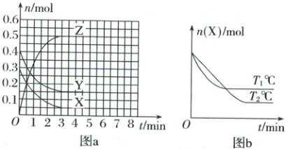 4. $T_0 ° C$时,在$2 L$的密闭容器中发生反应$ X(g) + Y(g) \rightleftharpoons Z(g)$(未配平),各物质的物质的量随时间变化的关系如图 a 所示。其他条件相同,温度分别为$T_1 ° C$、$T_2 ° C$时发生反应,X 的物质的量随时间变化的关系如图 b 所示。下列叙述正确的是 (