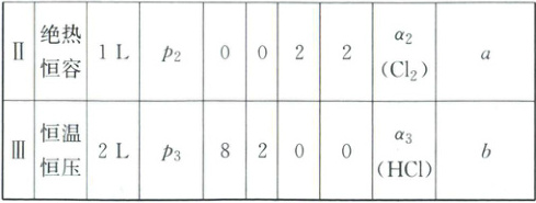 4.B 反应:$4HCl(g)+O_2(g)\rightleftharpoons2Cl_2(g)+2H_2O(g)\ \ \Delta H=-116kJ· mol^{-1}$,气态水转化为液态水时放热,故反应$4HCl(g)+O_2(g)\rightleftharpoons2Cl_2(g)+2H_2O(l)\ \ \Delta H<-116kJ· mol^{-1}$,故A错误;假设容器Ⅳ为恒温恒容,容器Ⅱ为绝热恒容,两者都是逆向反应建立的平衡,容器Ⅱ是绝热的,温度降低,不利于反应逆向进行,相比于容器Ⅳ达到平衡时,消耗的$Cl_2$更少,所以$a>1$,假设容器Ⅴ为恒温恒容,容器Ⅲ的类型为恒温恒压,两者都是正向进行的平衡,由于容器Ⅴ为恒容容器,所以反应开始后,容器Ⅴ中压强逐渐小于容器Ⅲ中压强,压强越小,越不利于反应正向进行,所以平衡时,容器Ⅴ中的$Cl_2$的物质的量小于容器Ⅲ中的,故$b>2$,故B正确;根据阿伏加德罗定律,温度相同、体积相同时,容器内的气体压强之比等于气体的物质的量之比,则$\frac{4mol+1mol}{2mol+2mol}=\frac{2×10^5Pa}{p_2}$,解得$p_2=1.6×10^5Pa$,由于容器Ⅲ体积和加入气体的物质的量都是容器Ⅰ的$2$倍,所以$p_3=2×10^5Pa$,故C错误;假设容器Ⅳ为恒温恒容,容器Ⅱ为绝热恒容,两者都是逆向反应建立的平衡,容器Ⅱ是绝热的,温度降低,不利于反应逆向进行,故$\alpha_1(HCl)+\alpha_2(Cl_2)<1$,故D错误。