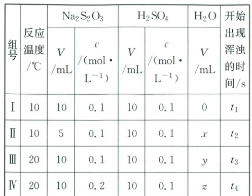 B 实验Ⅱ和实验Ⅰ相比较,变量为$\mathrm{Na_2S_2O_3}$的浓度,其他量均相同,由于溶液的总体积应为$20\ \mathrm{mL}$,则加入$\mathrm{H_2O}$的体积为$5\ \mathrm{mL}$,则$x = 5$,同理,$y = 0$,$z = 0$,A正确;温度越高,浓度越大,反应速率越快,实验Ⅳ的反应速率最快,实验Ⅲ与实验Ⅰ中$\mathrm{Na_2S_2O_3}$的浓度相同,但实验Ⅲ中的温度又比实验Ⅰ高,因此反应速率:Ⅲ>Ⅰ,实验Ⅰ中$\mathrm{Na_2S_2O_3}$的浓度比实验Ⅱ大,反应速率:Ⅰ>Ⅱ,则出现浑浊需要的时间:$t_2 > t_1$,B错误;实验Ⅰ、Ⅱ中$\mathrm{H_2SO_4}$的浓度均相同,只有$\mathrm{Na_2S_2O_3}$的浓度不同,可用于探究浓度对化学反应速率的影响,C正确;实验Ⅰ、Ⅲ中$\mathrm{Na_2S_2O_3}$、$\mathrm{H_2SO_4}$浓度都相同,温度不同,可用于探究温度对化学反应速率的影响,D正确。