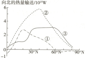 大气环流和大洋环流源源不断地从低纬度向高纬度输送热量。下图表示北半球向北的热量输送随纬度的变化。读图,完成3~4题。