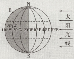 (2)题,昼夜半球各占一半说明图中最中间的经线是晨线或昏线,由太阳光线位置得出,图中中间20°W经线为晨线。第