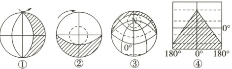 7.A 8.C [图①显示晨线与经线重合,应为春、秋分日,全球昼夜平分;图②显示地球呈顺时针方向自转,说明为南极俯视图,南极圈内出现极昼现象,应为12月22日前后,此时北极点出现极夜现象,正午太阳高度不是最大;图③显示北极圈出现极昼现象,应为6月22日前后,图②与图③所示日期不同;图④北极圈出现极昼现象,此时太阳直射北回归线,漠河位于北半球高纬度地区,故此时是漠河白昼最长的一天。]