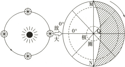 下图为二分二至日太阳公转位置及某日日照示意图,$\stackrel\frown{MQN}$为晨昏线,斜线区域为黑夜,非斜线区域为白天。据此完成3~4题。