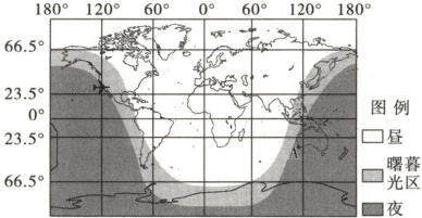 有报道称,一年中某时刻世界上99%的人口都将“沐浴在阳光之下”。经精确统计,该时刻全球将有83%的人处于白昼,16%的人处于曙暮光(太阳位于地平线以下0°~18°)中。下图为该时日照示意图。据此完成1~2题。