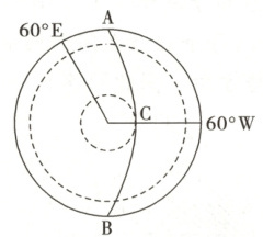 9.D 10.C [第9题,图中60°E与60°W相隔120个经度,由此判断地球的自转方向为逆时针,则该图为北极点俯视图;由于BC为晨线,则弧线ACB左侧为夜半球,右侧为昼半球;60°W平分弧线ACB,大部分位于昼半球,其地方时应为12:00;根据地方时的计算公式,计算合肥117°E的地方时应为23:48,D正确。第10题,根据上题分析可知,此时北极圈内有极夜现象,是北半球冬至日,太阳直射南回归线,A、D错误;60°W的地方时应为12:00,为太阳直射的经线,B错误,C正确。]