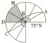 (1)题,ABC为晨昏线,B点为ABC与纬线75°N的切点,MB所在经线地方时为0:00,故75°N以北地区出现极昼,太阳直射15°N。D所在经线的经度为180°,相邻经线间隔为30°,从北极点观察,地球呈逆时针方向转动,则0时经线为120°E,故地方时12:00的经线为60°W。第