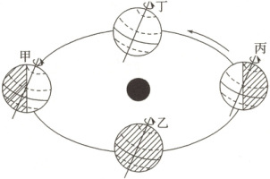 2023年冬至是12月22日,2024年春节是2月10日。下图示意二分二至时地球在公转轨道上的位置。读图,回答1~2题。