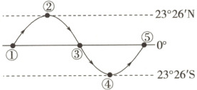 3.B 4.D [第3题,若图中①为北半球春分日,根据太阳直射点回归运动规律可知,②为夏至日,③为秋分日,④为冬至日,⑤为春分日。第4题,结合所学知识可知,从5月1日到夏至日(6月22日前后),太阳直射点位于北半球并向北移动;夏至日(6月22日前后)至10月1日,太阳直射点向南移动。所以从5月1日到10月1日,太阳直射点的移动方向是先向北再向南。]