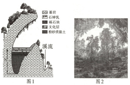 (2024·广东卷)发育于云南省临沧市某处半山腰的硝洞是一个石灰岩溶洞,洞内有较厚的夹杂石灰岩砾石块的粉砂质黏土沉积物,其表层有约2 m厚的文化层(含有古人类活动遗留物的沉积层)。图1为硝洞剖面示意图,图2为自洞内望向洞口方向的景观照片。据此完成3~4题。