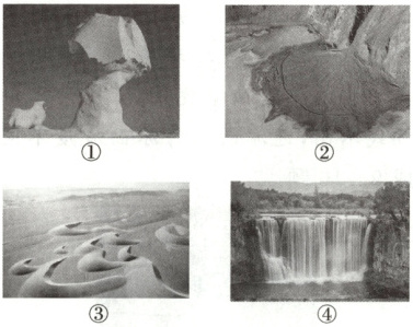 5.D 6.C [第5题,本题考查外力作用与地貌。①风蚀蘑菇对应风力侵蚀作用;②冲积扇对应流水堆积作用;③沙丘对应风力堆积作用;④瀑布对应流水侵蚀作用。第6题,本题考查外力作用与地貌的分布。①和③地貌都是因风力作用形成的,多见于我国西北内陆地区,A错误;我国青藏高原海拔高,周边地区多高山,④地貌可见,但③地貌少见,B错误;根据③中新月形沙丘的形态可以判断风向,沙丘的缓坡是迎风坡,C正确;②为冲积扇,沉积物颗粒大的先沉积在扇顶,沉积物颗粒小的后沉积在扇缘,D错误。]